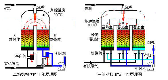 RTO(regenerative thermal oxidizer)為蓄熱式熱氧化反應(yīng)器。其原理是把有機(jī)廢氣加熱到760°(具體需要看成分)以上,使廢氣中的VOC在氧化分解成二氧化碳和水。氧化產(chǎn)生的高溫氣體流經(jīng)特制的陶瓷蓄熱體,使陶瓷體升溫而“蓄熱”,此“蓄熱”用于預(yù)熱后續(xù)進(jìn)入的有機(jī)廢氣。從而節(jié)省廢氣升溫的燃料消耗。陶瓷蓄熱室應(yīng)分成兩個(gè)(含兩個(gè))以上,每個(gè)蓄熱室依次經(jīng)歷蓄熱-放熱-清掃等程序,周而復(fù)始,連續(xù)工作。蓄熱室“放熱”后應(yīng)立即引入適量潔凈空氣對(duì)該蓄熱室進(jìn)行清掃(以保證VOC去除率在98%以上),只有待清掃完成后才能進(jìn)入“蓄熱”程序。否則殘留的VOCS隨煙氣排放到煙囪從而降低處理效率。